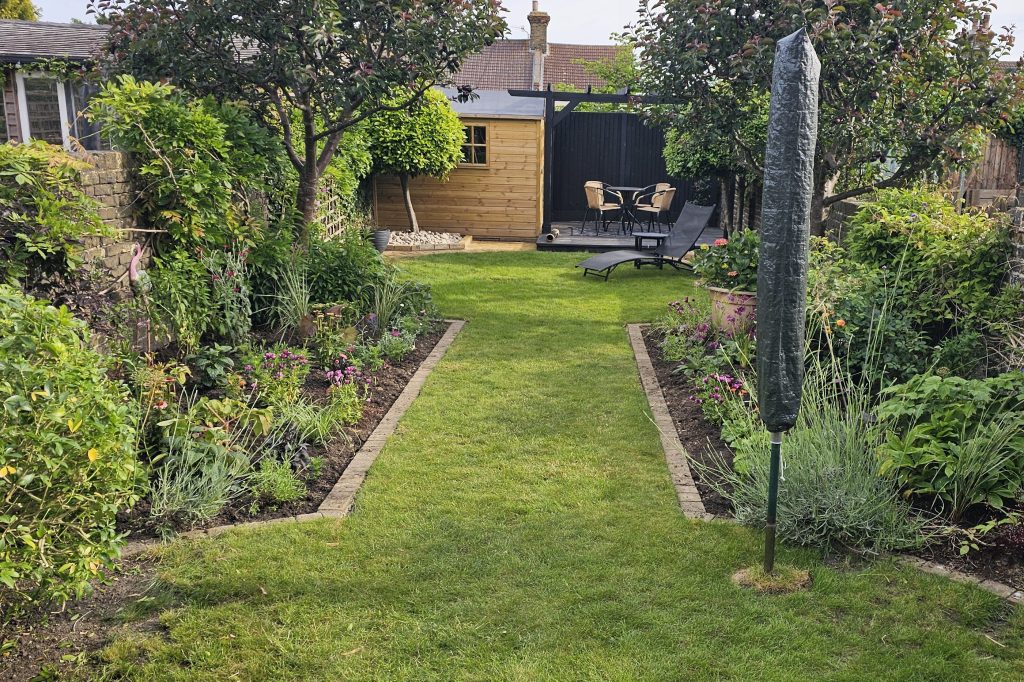 Here’s a good example of a longer garden. Below is the original design, with 3 large rings, with some planting and 2 small trees.