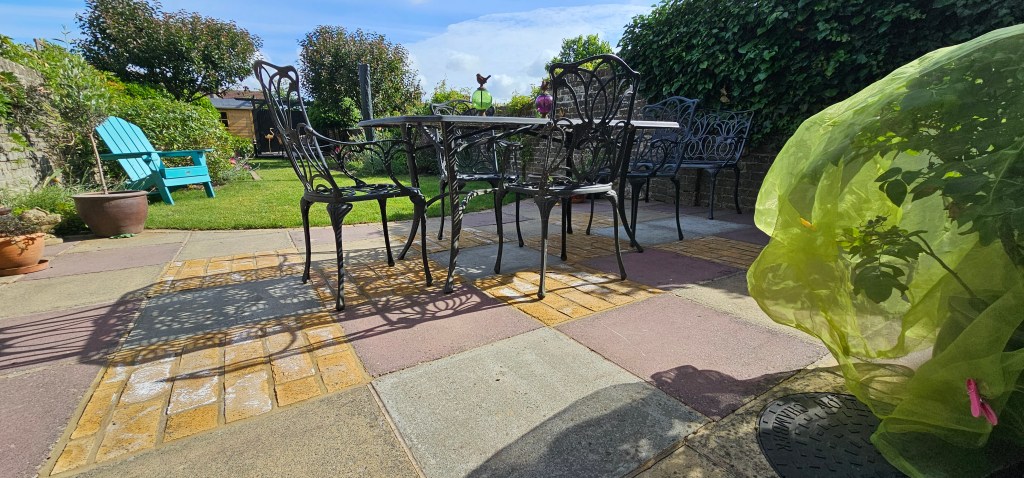 All the timber was then painted, a new shed installed (separately) and additional yellow bricks laid nearest the shed and decking.